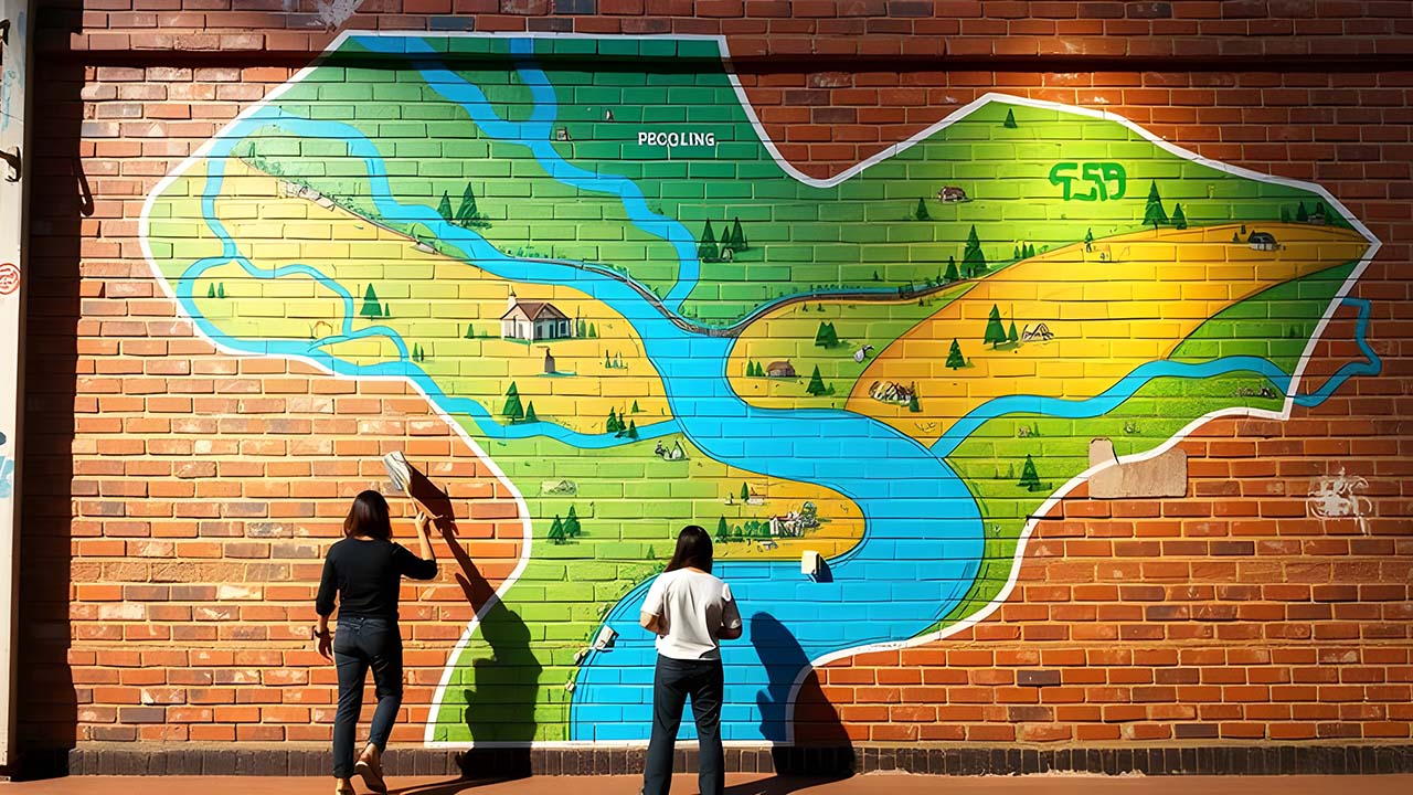 - Day 1: Memory Mural Marianne and Sarah collaborated on a large mural on a brick wall, using recycled paints. The mural depicted a map of the valley, with its rivers, fields, and houses rendered in shades of blue and green, forming a clear network of waterways, reminding viewers that water is the lifeblood of the land. As the paint dried, the mural seemed to breathe new life into the faded surroundings.
