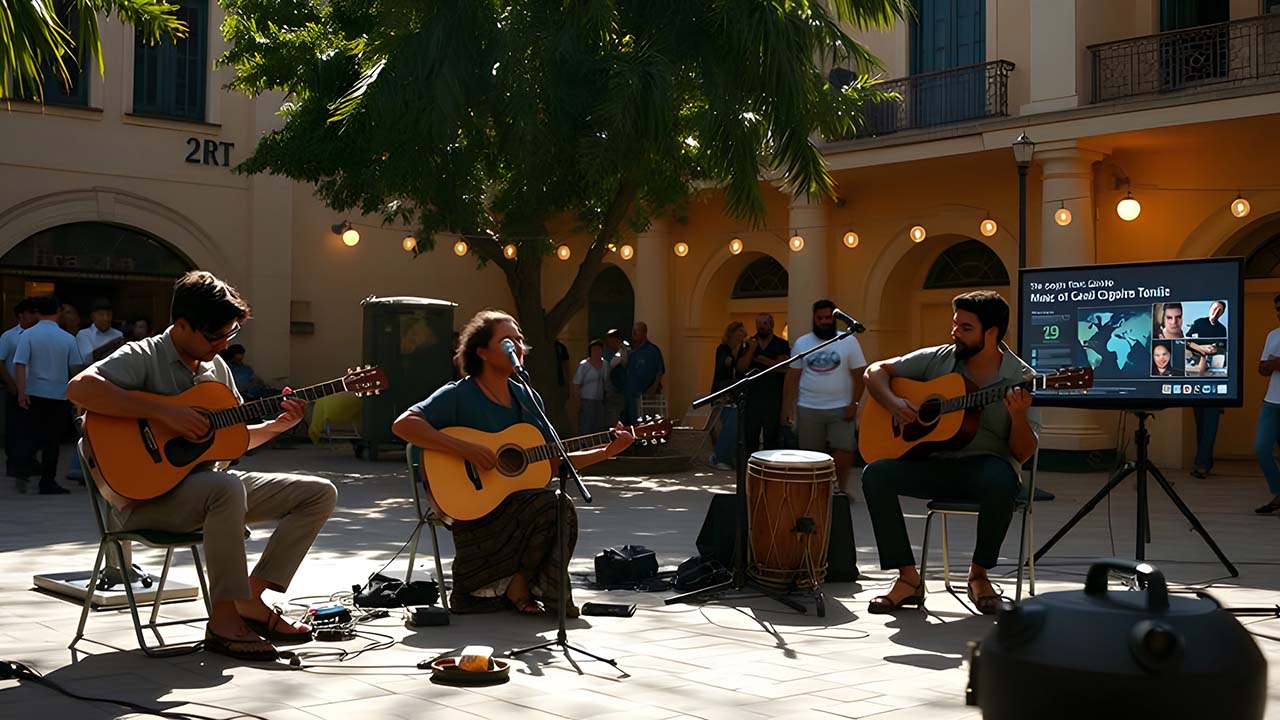 - Day 3: Sounds of the Soil Leo and Amir performed in the square, using percussion instruments made from local scrap wood and metal to create a rhythmic soundtrack that evoked the sounds of the earth. The music gradually built to a hopeful crescendo. Simultaneously, a screen displayed real-time data on the town’s carbon footprint. The music and data intertwined, creating a “living public service demonstration” that told a story of consumption and possibility.